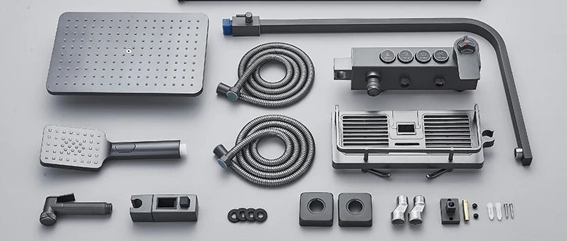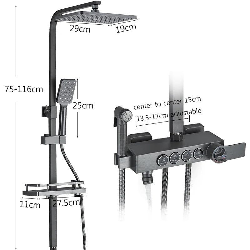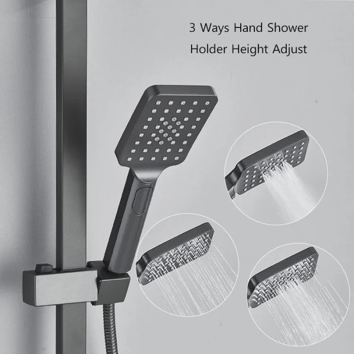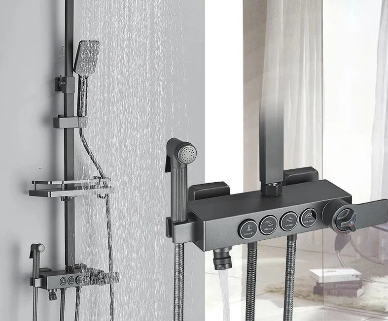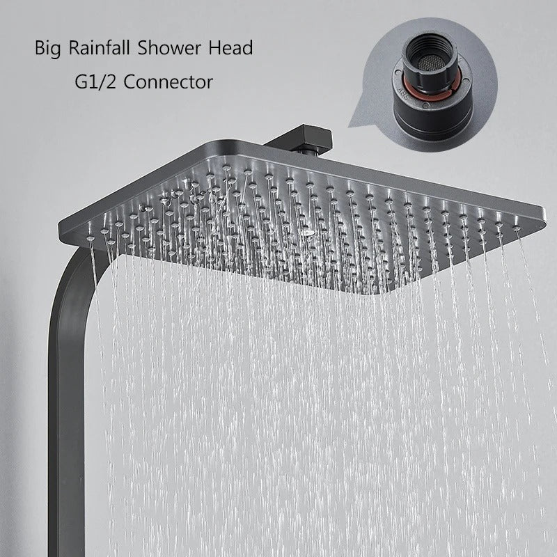 Coloana de duș cu termostat și 4 funcții este soluția ideală pentru o experiență premium în baie. Sistemul termostatic menține temperatura constantă a apei, oferind confort și siguranță în utilizare. Capul de duș tip ploaie și para mobilă completează experiența, transformând fiecare duș într-un moment relaxant.