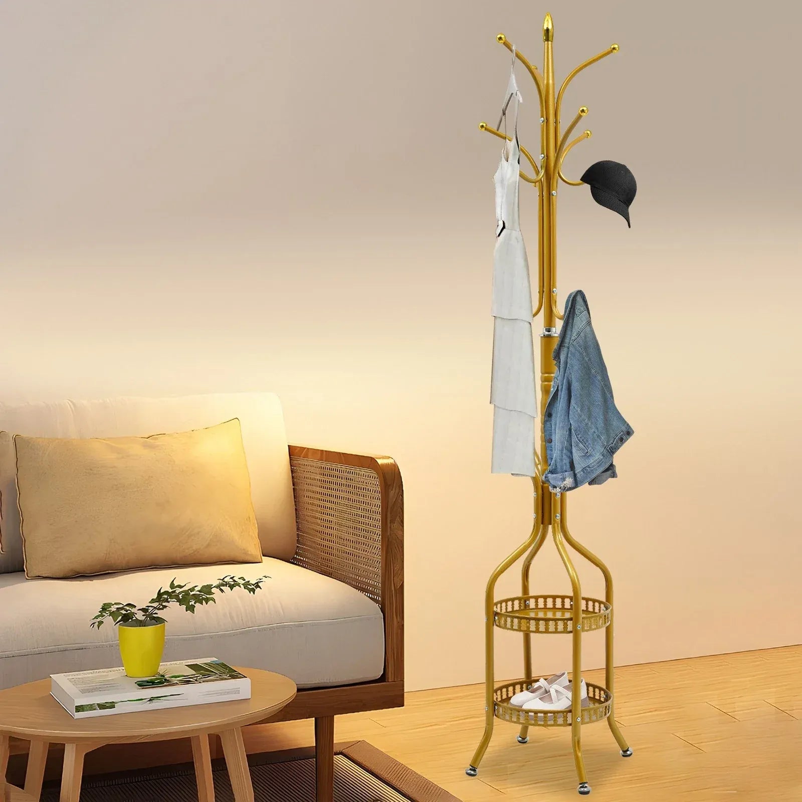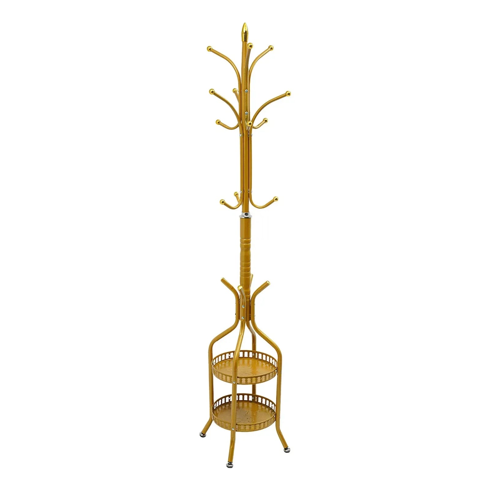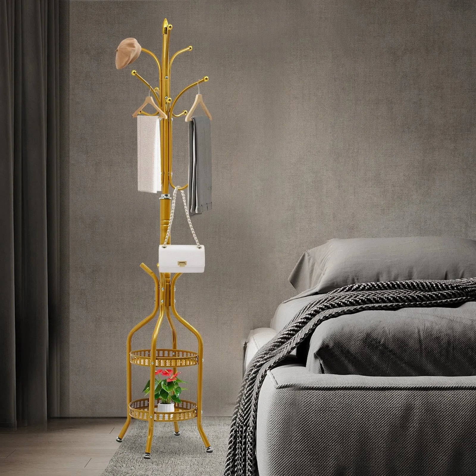 Organizează eficient holul, dormitorul sau biroul cu acest cuier de podea metalic tip hall tree, cu finisaj auriu elegant. Designul vertical și compact îmbină funcționalitatea cu estetica modernă, oferind multiple cârlige pentru haine și 2 rafturi practice pentru depozitarea pantofilor, genților sau altor accesorii.