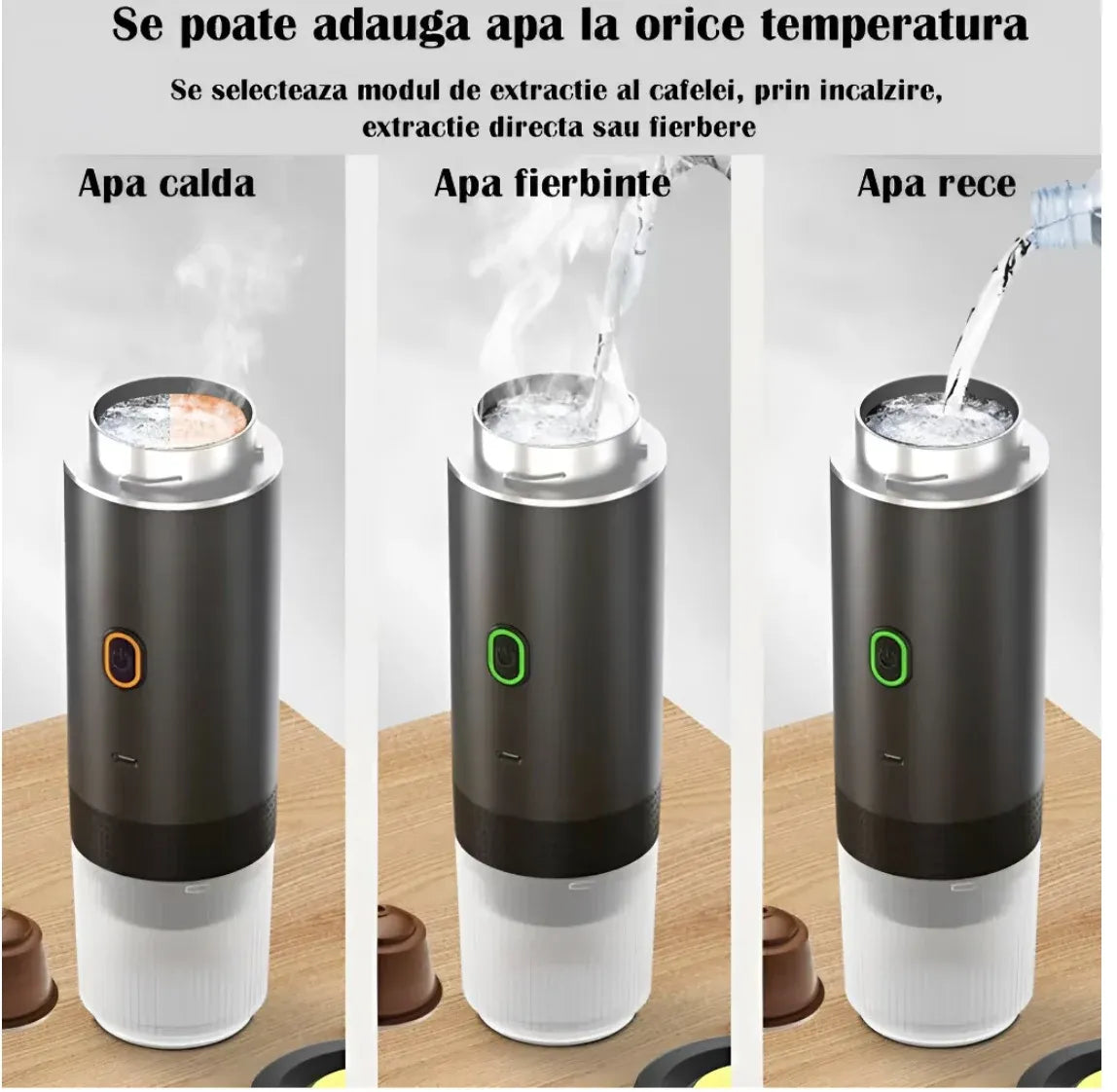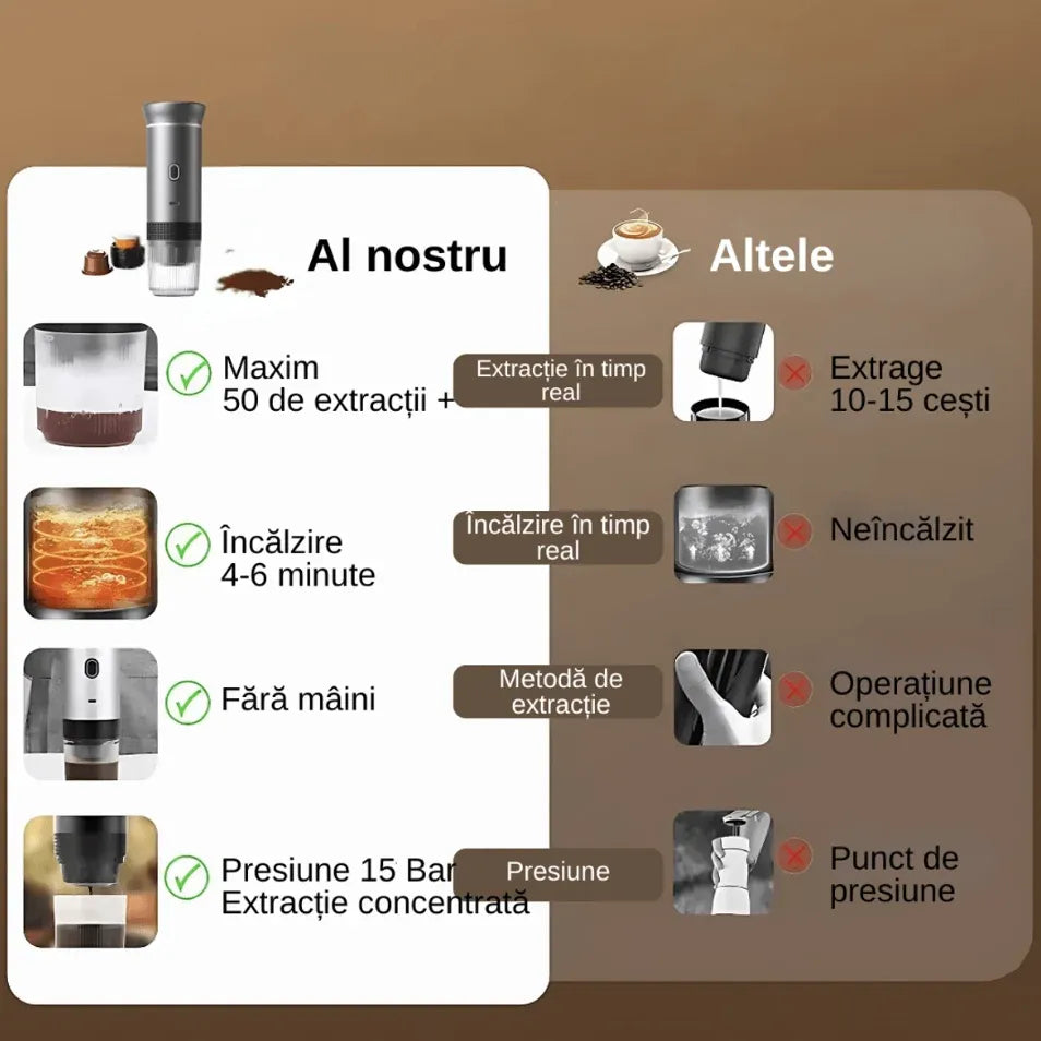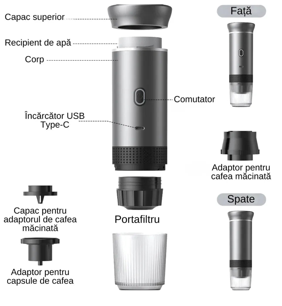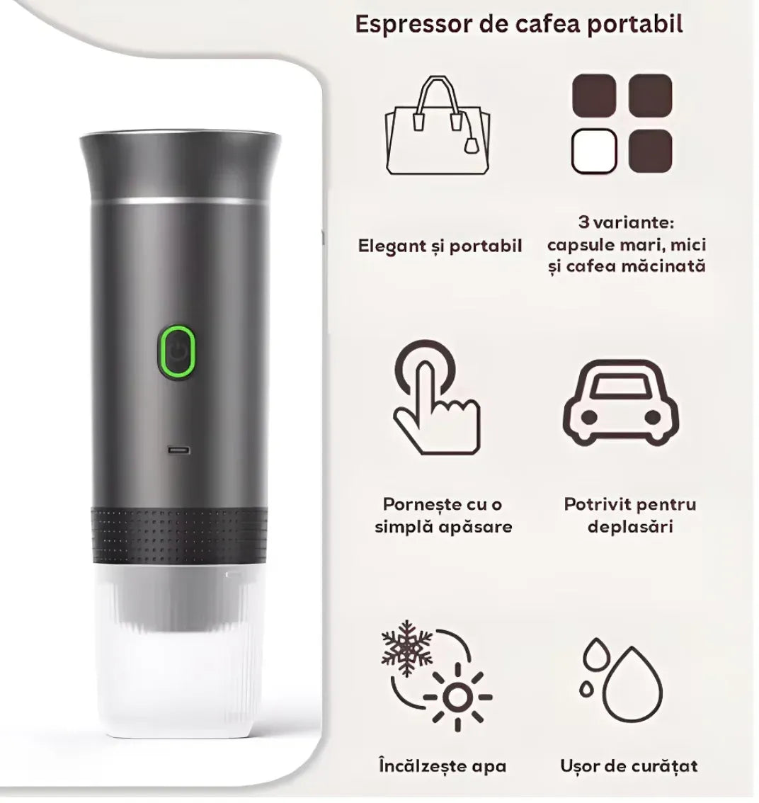 Bucură-te de cafea proaspătă oriunde te-ai afla cu espressorul portabil pentru cafea, conceput pentru a funcționa cu capsule compatibile Nespresso și Dolce Gusto. Compact, ușor de transportat și simplu de utilizat, acest espressor este soluția ideală pentru călătorii, birou, camping sau drumuri lungi, oferind o experiență autentică de cafea fără a depinde de o cafetieră clasică.