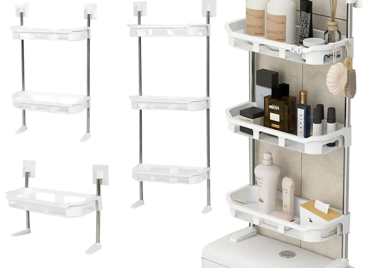 - Structură cu 3 etajere: organizare eficientă pe verticală pentru produse de baie.