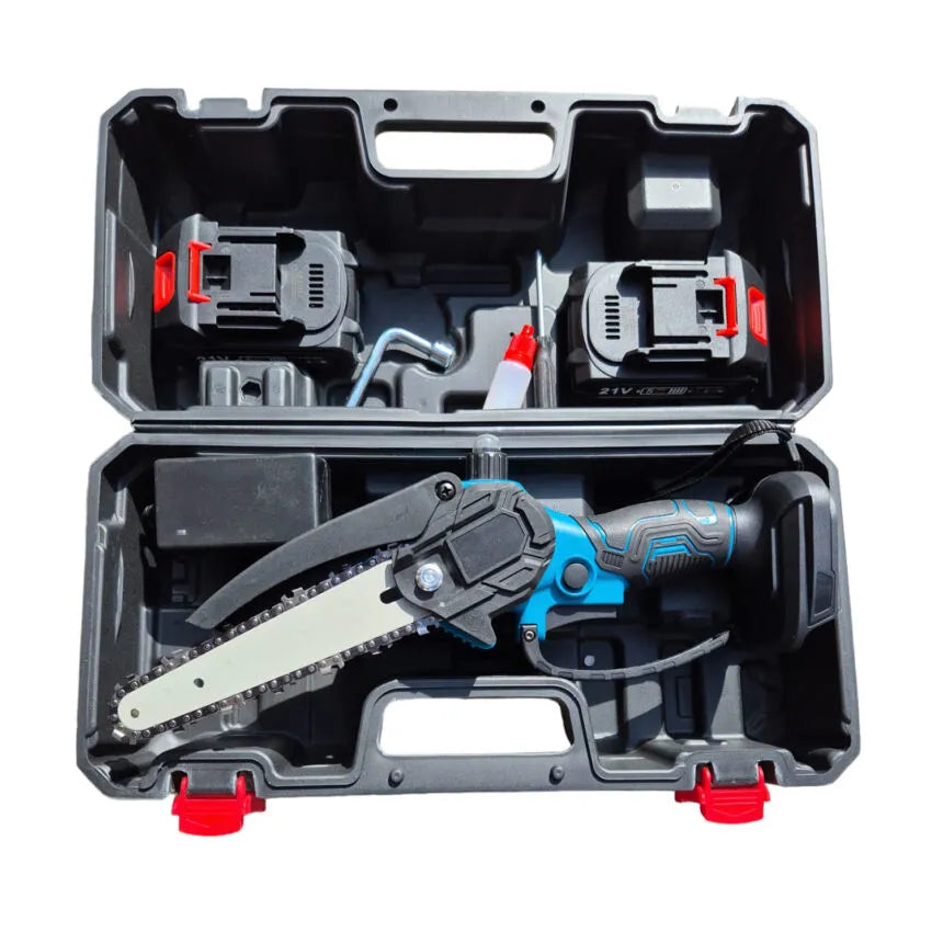 Mini Fierăstrău Electric 6” (15 cm) 48V – Drujbă Compactă cu 2 Acumulatori, 2 lant și Rezervor Ulei