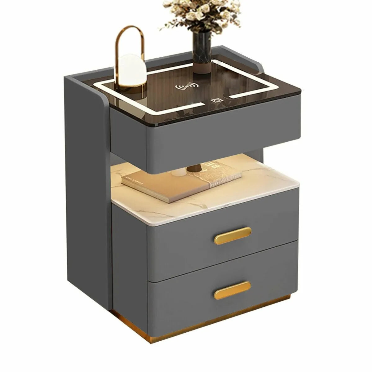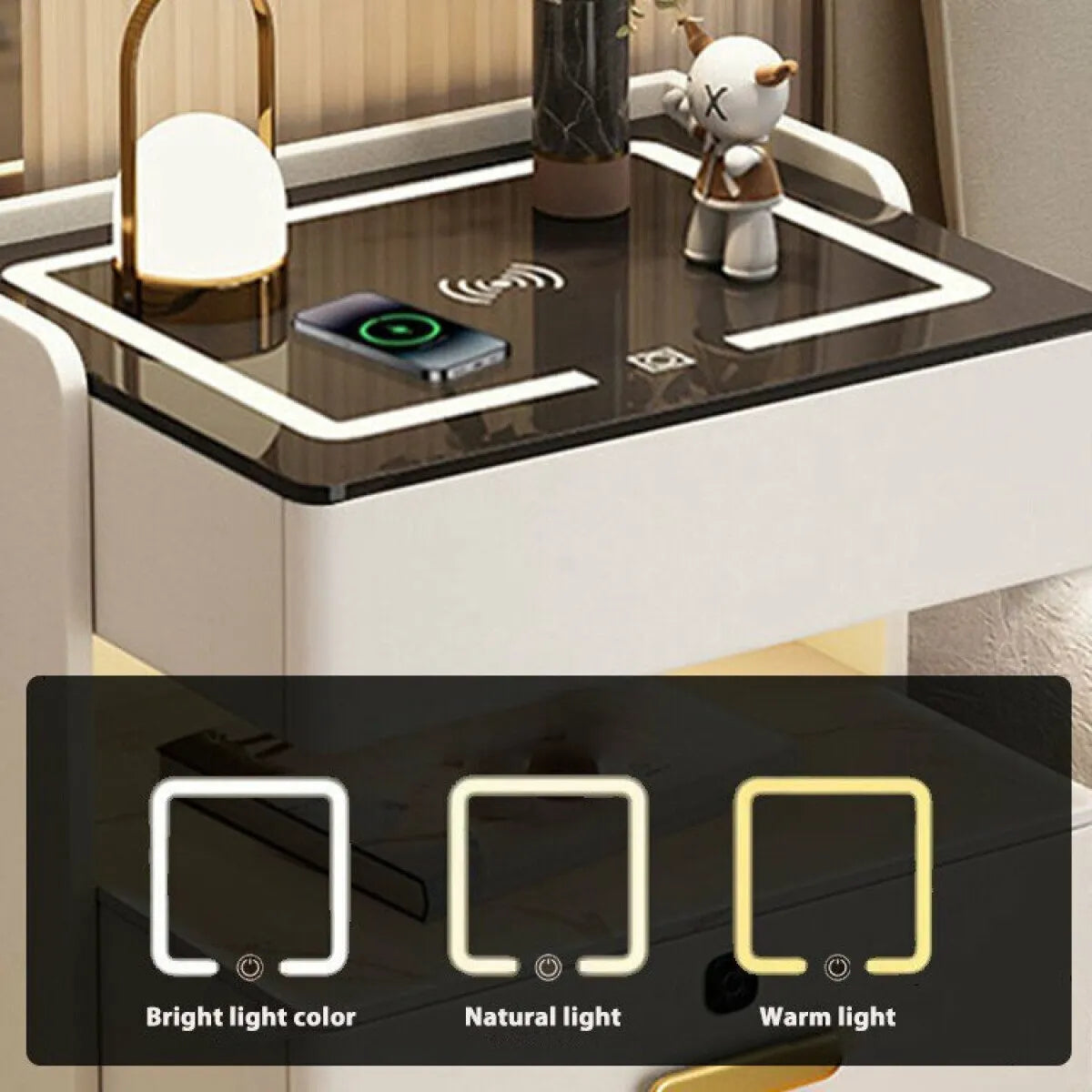 Transformă dormitorul într-un spațiu modern și funcțional cu această noptieră inteligentă, concepută pentru confort și organizare eficientă. Dotată cu încărcare wireless pentru telefon, iluminare LED ambientală și 3 sertare spațioase, noptiera îmbină tehnologia cu un design elegant din sticlă și lemn, fiind ideală pentru dormitoare contemporane.