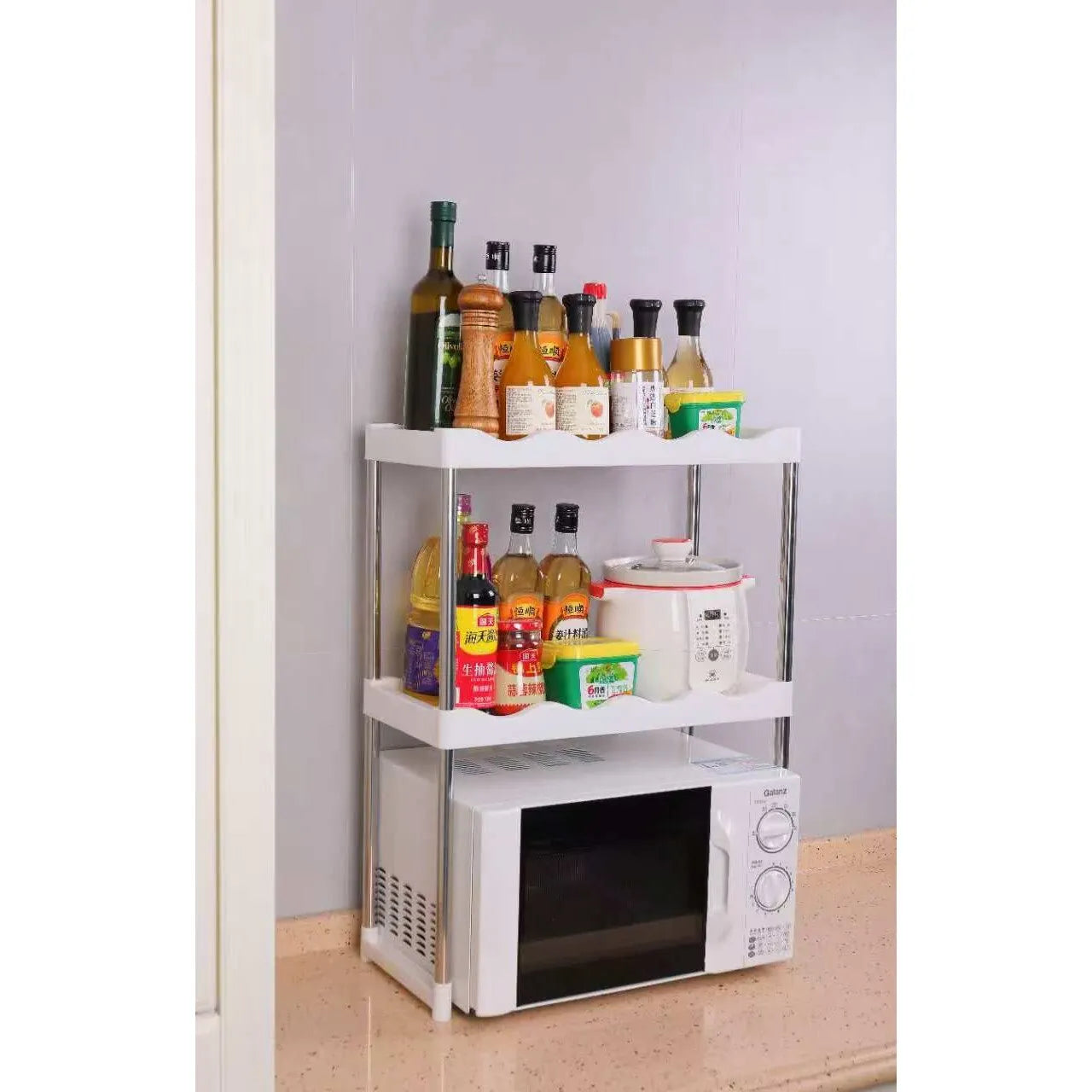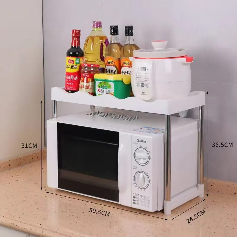 Optimizează spațiul din bucătărie cu raftul extensibil pentru cuptorul cu microunde, conceput pentru organizare eficientă și stabilitate sporită. Realizat din metal și plastic rezistent, acest suport multifuncțional permite ajustarea pe lățime, fiind compatibil cu diferite dimensiuni de cuptoare cu microunde și oferind spațiu suplimentar pentru depozitarea accesoriilor de bucătărie.
